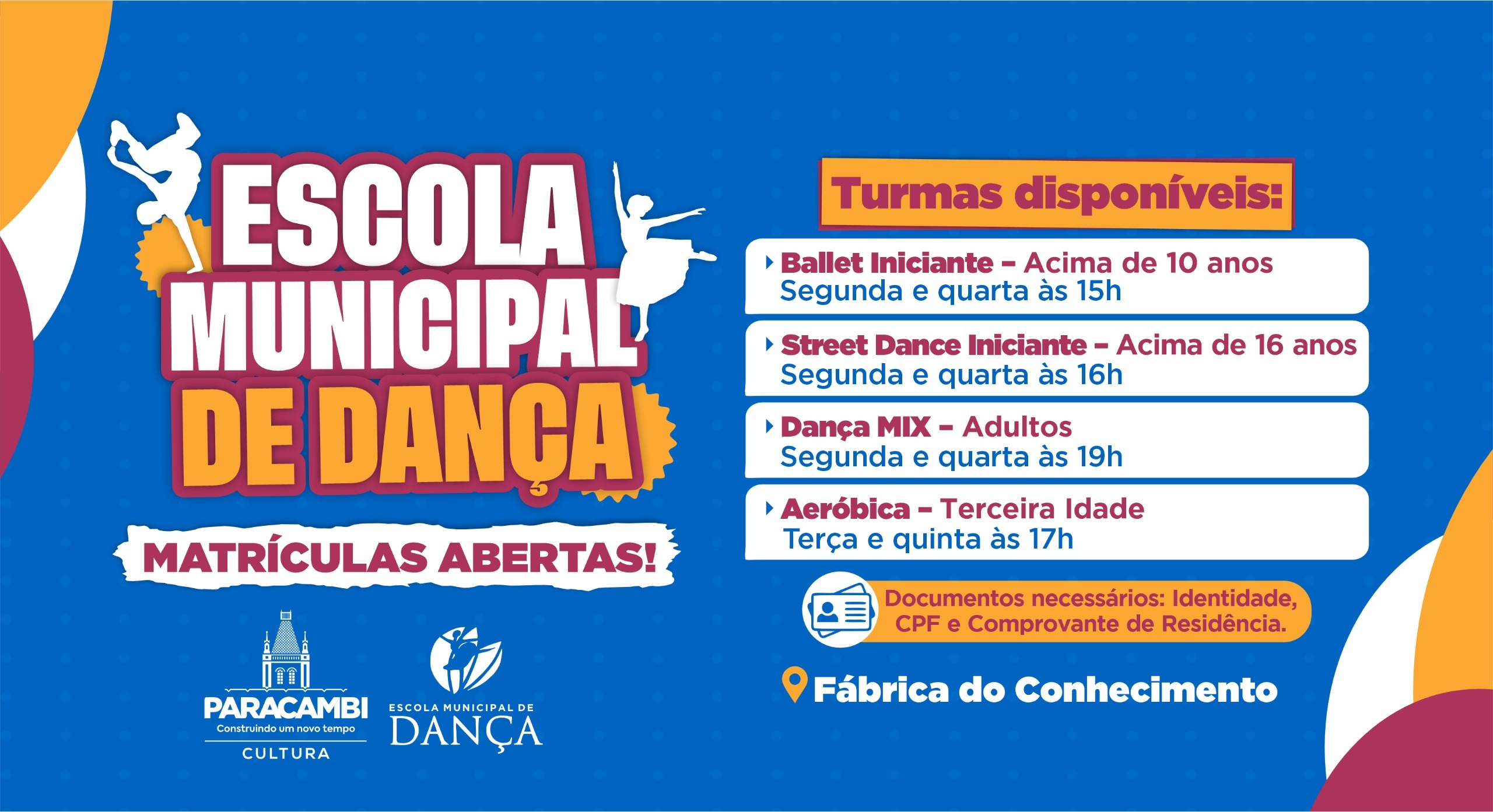A Escola Municipal de Dança de Paracambi está com vagas gratuitas disponíveis para diversas turmas. As inscrições devem ser feitas na sede da Secretaria Municipal de Cultura, localizada na Fábrica do Conhecimento. O atendimento é realizado de segunda a sexta, das 10h às 16h30.
