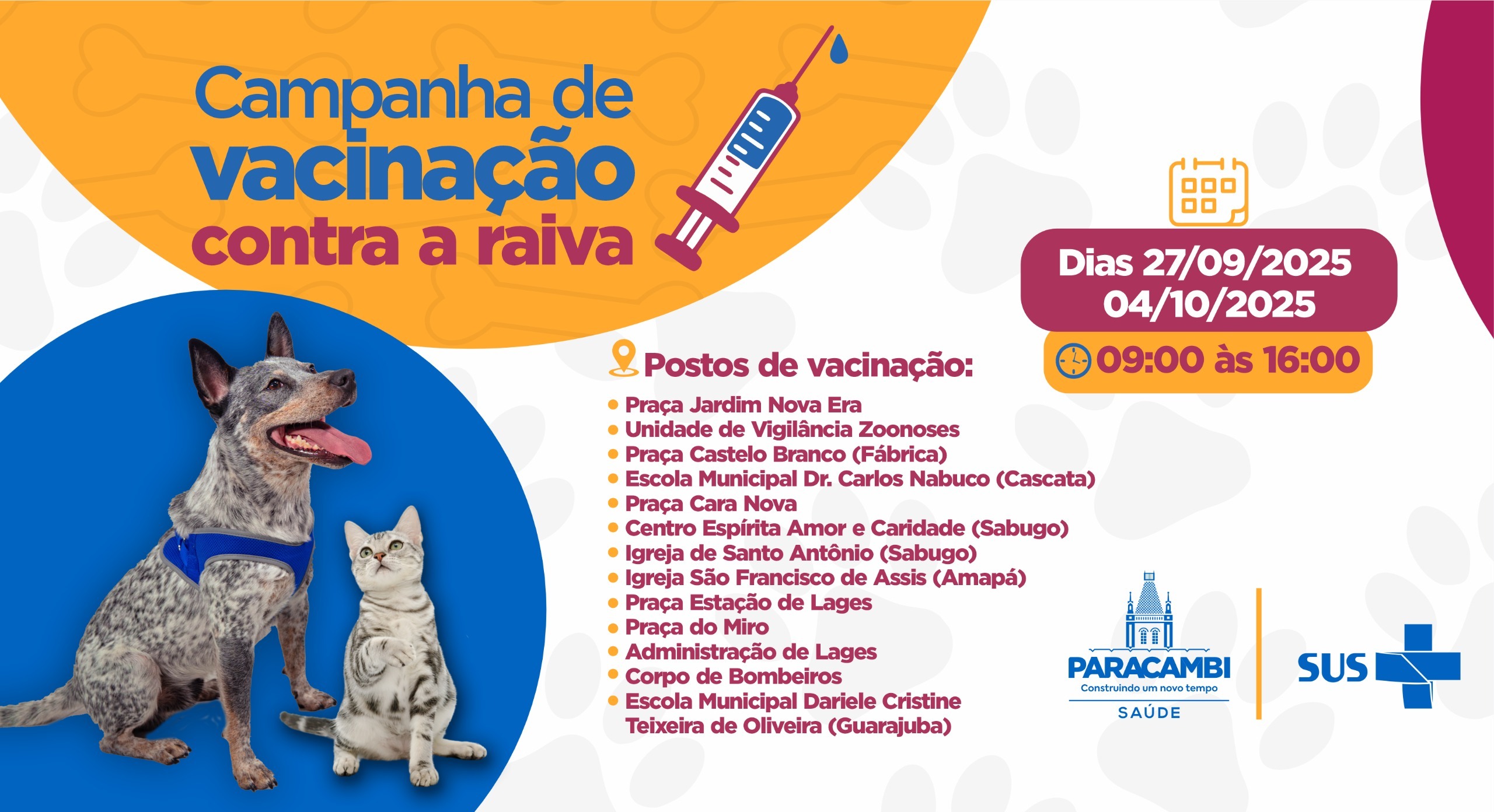A Prefeitura de Paracambi, por meio da Secretaria Municipal de Saúde, promoverá, nos próximos dois sábados, a campanha de vacinação contra a raiva. A vacina é destinada a cães e gatos, que devem ser imunizados para prevenir a transmissão dessa grave doença, que pode atingir tanto os animais quanto os seres humanos.