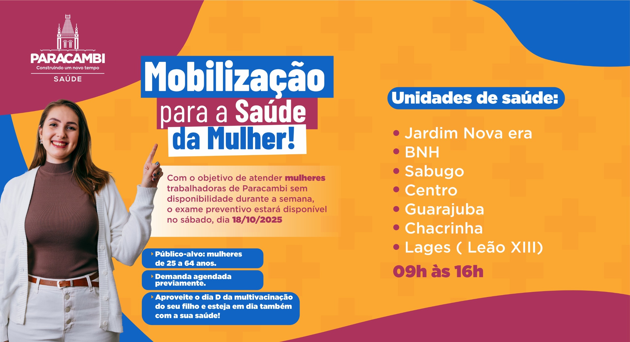 Neste sábado (18), a Prefeitura de Paracambi, por meio da Secretaria Municipal de Saúde, realizará duas importantes ações em vários bairros: o Dia D da Multivacinação e uma mobilização especial voltada para as mulheres do município. Os serviços serão disponibilizados das 9h às 16h nas seguintes unidades de saúde: