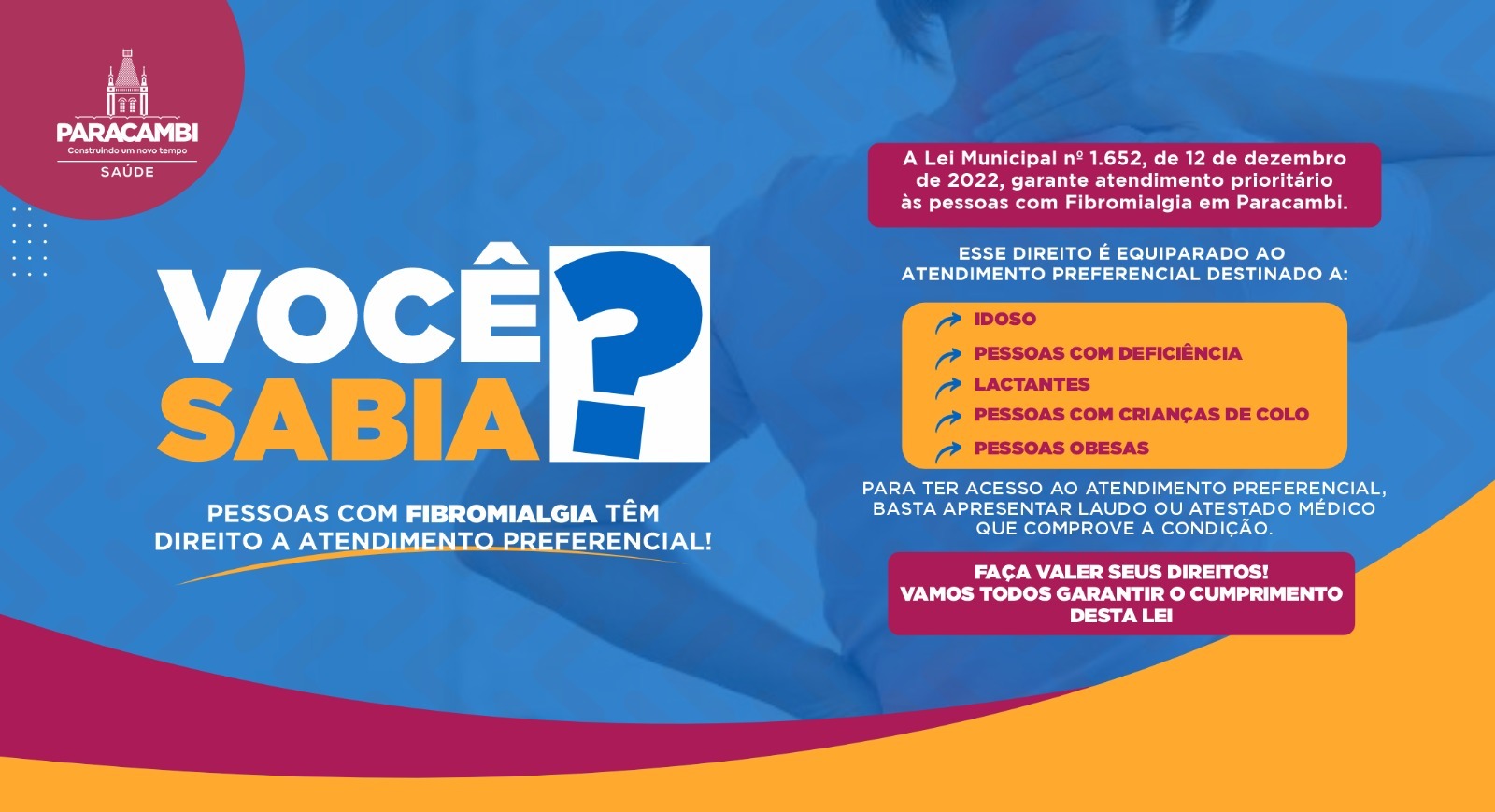 A Lei Municipal n° 1.652, de 12 de dezembro de 2022, garante atendimento prioritário às pessoas com Fibromialgia em todos os estabelecimentos de Paracambi, seja público ou privado.