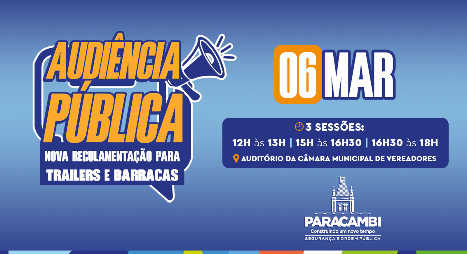 A Prefeitura de Paracambi, por meio da Secretaria Municipal de Segurança e Ordem Pública, realizará uma audiência pública para debater a nova regulamentação de trailers e barracas nas vias públicas. O encontro acontecerá no auditório da Câmara Municipal de Vereadores, no dia 06 de março de 2026, em três sessões: das 12h às 13h, das 15h às 16h30 e das 16h30 às 18h.