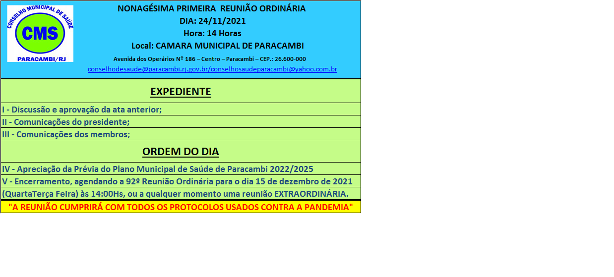 NOTÍCIAS “91ª REUNIÃO ORDINÁRIA DE NOVEMBRO DE 2021 DO CONSELHO DE SAÚDE DE PARACAMBI” 18 de novembro de 2021 CMS