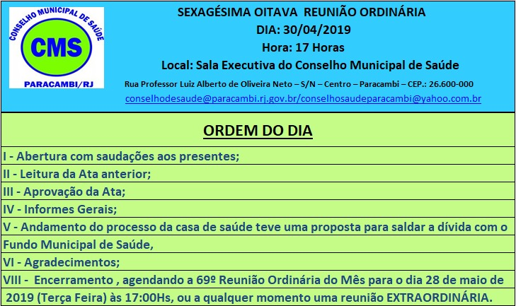 Read MoreAconteceu no dia 30 de abril de 2019 a 68ª Reunião Ordinária do Conselho Municipal de Saúde de Paracambi, onde
